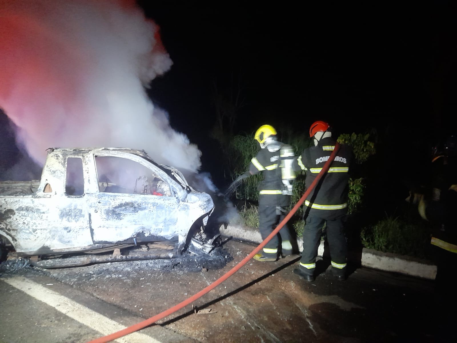 Conforme o Corpo de Bombeiros, quando as equipes chegaram ao local encontraram a caminhonete já tomada pelo fogo e praticamente destruída. No interior do veículo havia um corpo completamente carbonizado.
