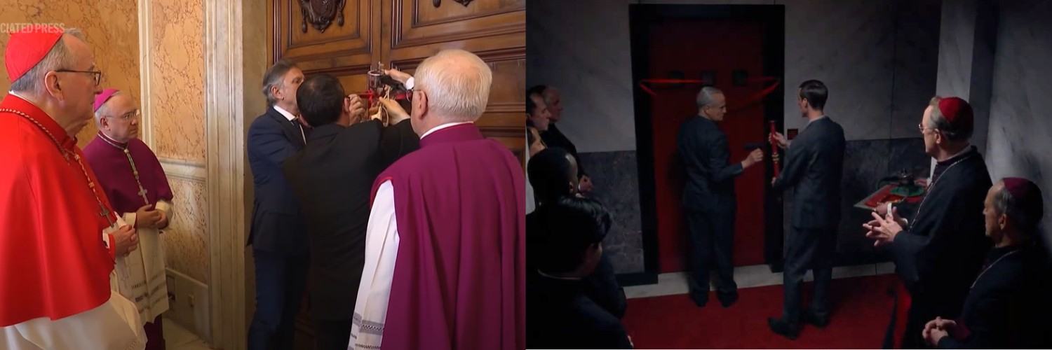 Compare a cena de “Conclave” e o momento em que o aposento de Francisco foi selado:
