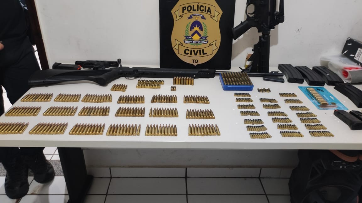 Suspeito de 38 anos foi preso após cerco feito pelas polícias Civil e Militar. Equipes disseram que apreenderam grande quantidade de armas e munições na casa dele. Armas de fogo e diversas munições são apreendidas durante operação da Polícia Civil, em Colinas do Tocantins