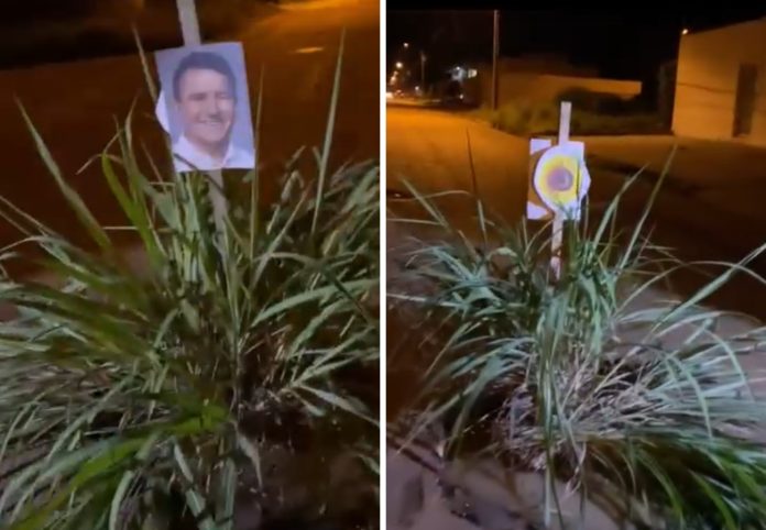 No vídeo postado pela página Tu Viu Palmas, no Instagram, a foto do prefeito aparece em uma estaca, dentro de um buraco junto com uma moita de capim. Atrás do rosto de Eduardo foi fixada também uma foto de um girassol, um dos símbolos da gestão do político.