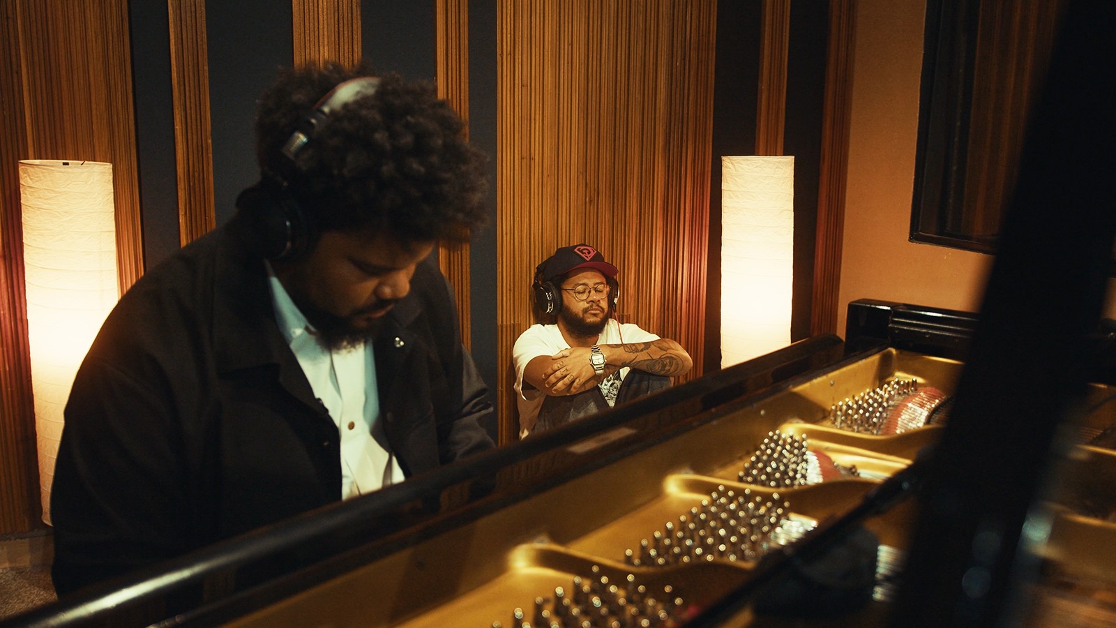 Amaro Freitas (à esquerda) toca piano no estúdio em que gravou participação em três faixas do álbum de Emicida